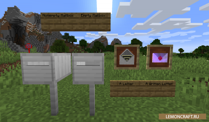 Мод на почтовый ящик Mailboxes добавляет в игру новый блок с помощью которого вы сможете обмениваться со своими друзьями письмами и даже помещать в него различные предметы. Для начала вам нужно создать письмо, потом кликнуть на нем ПКМ и отредактировать, после этого сохраняете созданное письмо нажав крестик. Для отправки письма используется команда /sendletter . После этого данное письмо будет доступно вашему другу в его почтовом ящике.